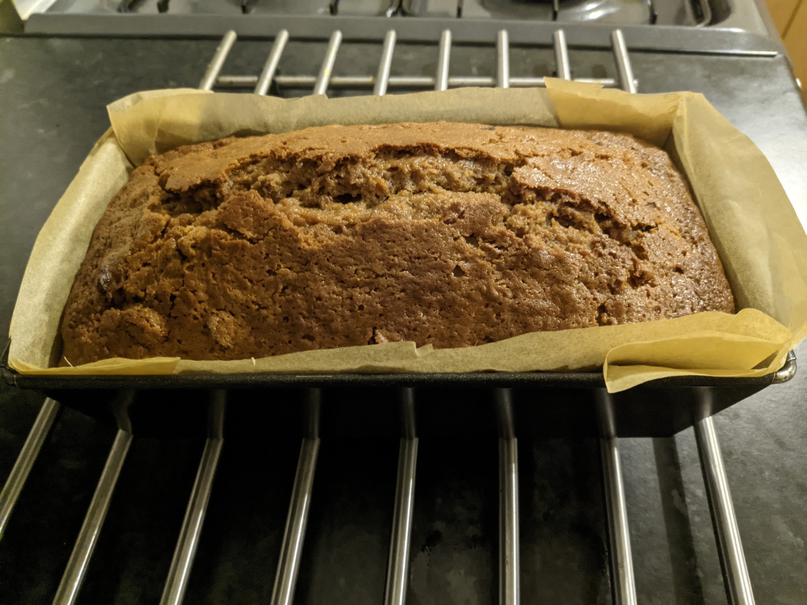 - Pour into a lined loaf tin and bake at 160C for ~1hr15, covering with foil if it gets too dark.